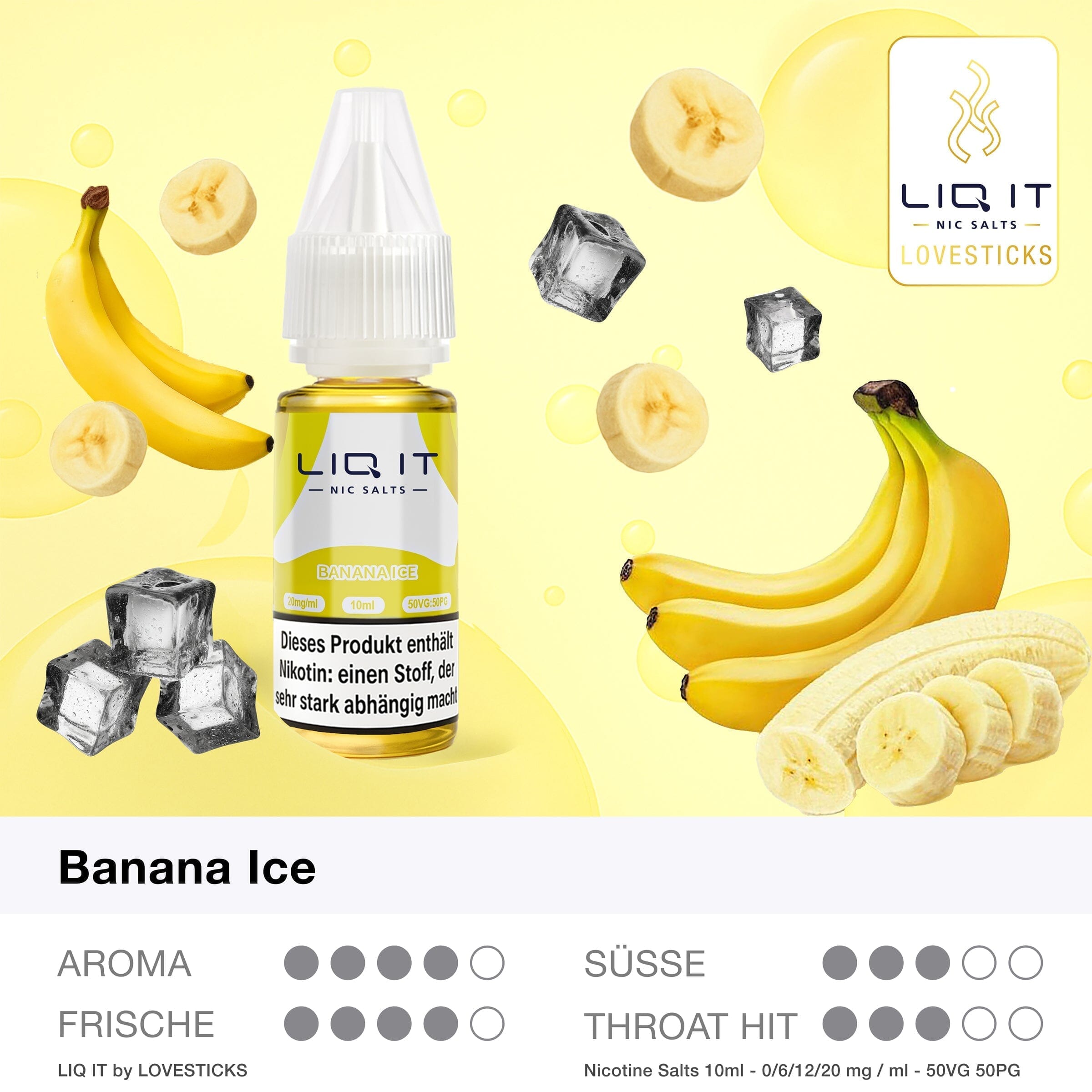 Banana Ice LIQIT ist in 10-ml-Flaschen erhältlich und in verschiedenen Nikotinstärken sowie nikotinfrei verfügbar. Das Liquid wird mit Nikotinsalz angeboten und ist für die Verwendung in nachfüllbaren E-Zigaretten vorgesehen.
